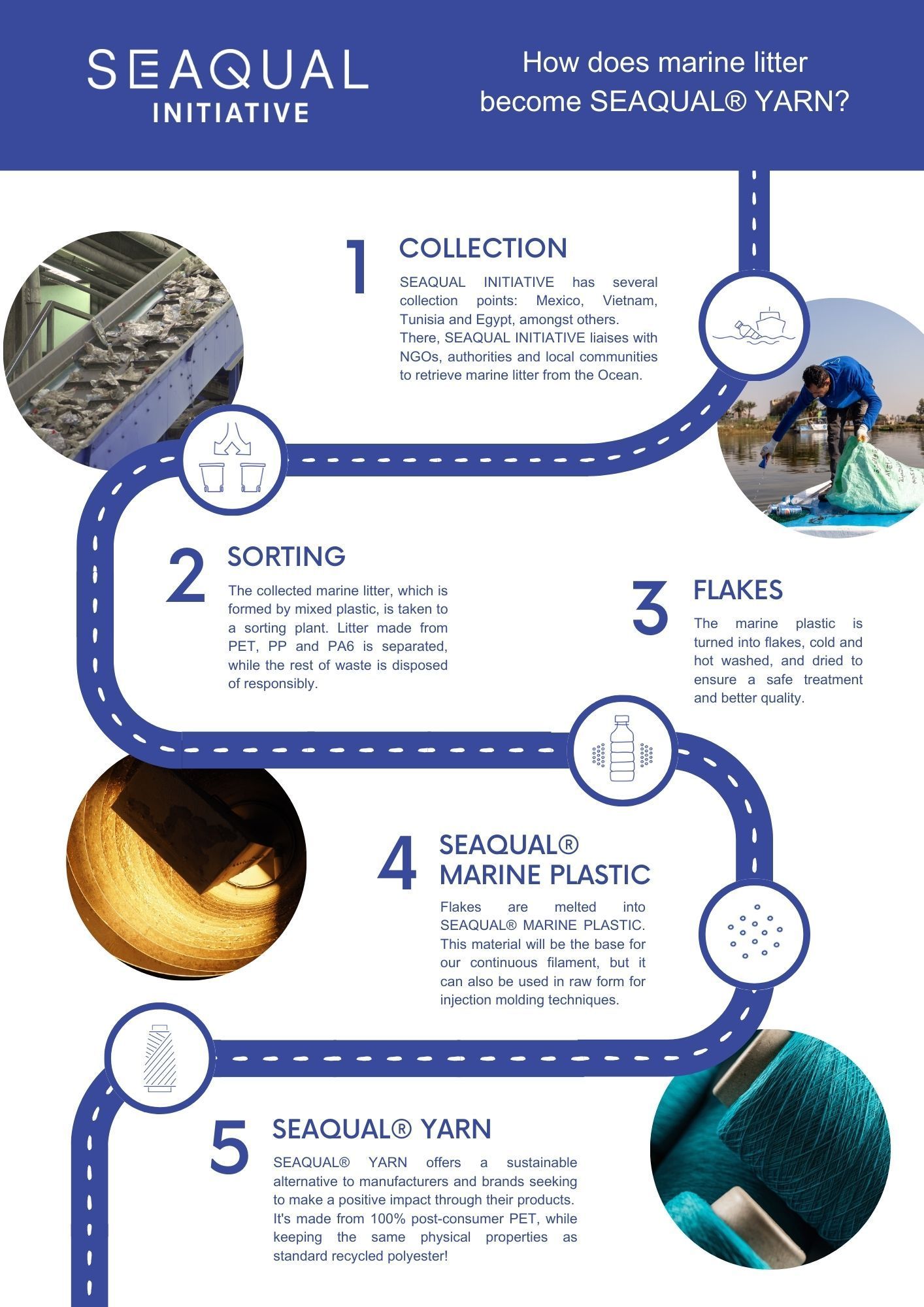 A SEAQUAL INITIATIVE trabalha com ONGs, pescadores, autoridades e comunidades locais para ajudar a limpar os nossos oceanos. Os programas de limpeza recolhem lixo marinho das nossas praias, do fundo e da superfície do mar, dos rios e dos estuários. Os resíduos marinhos são então separados em diferentes tipos de materiais, a parte plástica é limpa e convertida em 'SEAQUAL® MARINE PLASTIC'. Marcas de varejo e fabricantes ambientalmente conscientes transformam essa nova matéria-prima totalmente rastreável em produtos impressionantes e sustentáveis para todos os aspectos de nossas vidas. O poder de compra do consumidor é uma das ferramentas mais poderosas para a mudança. Ao escolher produtos que contêm 'SEAQUAL® MARINE PLASTIC', você está ajudando a limpar nossos oceanos.