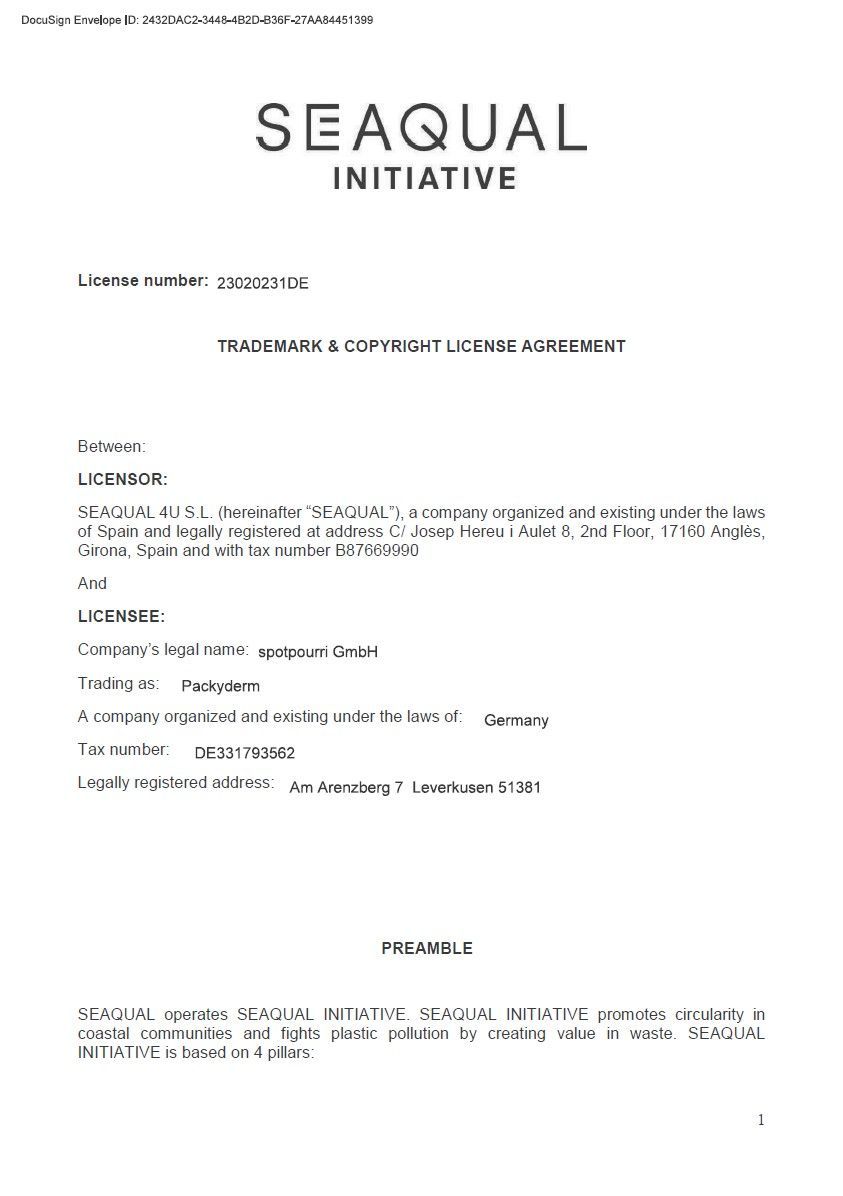 A Packyderm compromete-se a utilizar pelo menos 50 por cento em peso dos materiais feitos de SEAQUAL® YARN na produção de produtos que sejam anunciados com referência ao uso de SEAQUAL® YARN. Nem todos os materiais de um produto podem ser feitos de SEAQUAL® YARN. Esforçamo-nos por escolher o melhor compromisso entre sustentabilidade e relação custo-benefício, com foco na sustentabilidade. No entanto, o produto mais sustentável não ajuda o ambiente se não for adquirido porque o preço de venda é demasiado elevado e, portanto, as pessoas escolhem alternativas que não são fabricadas de forma justa.